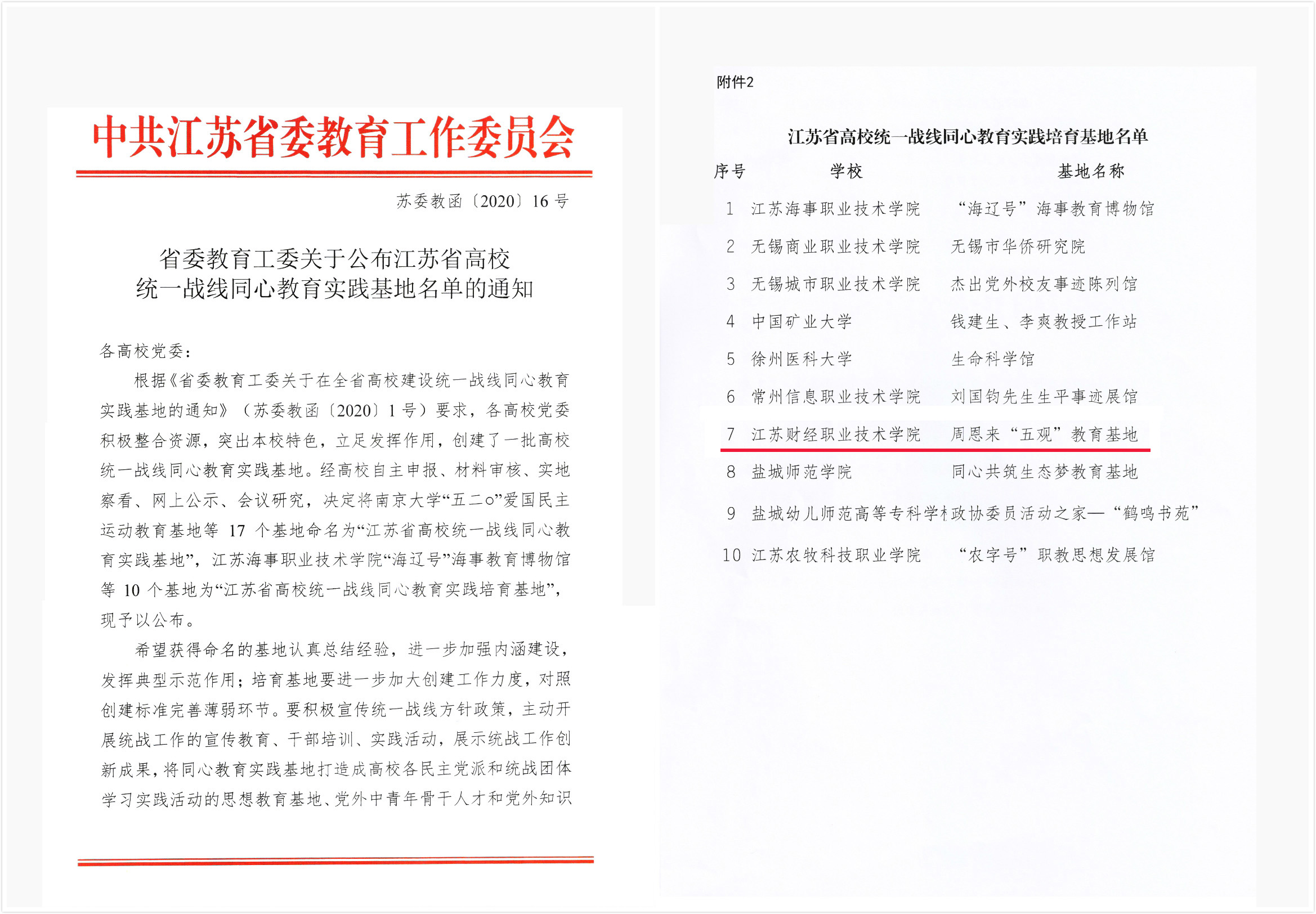近日,江苏省委教育工委下发《关于公布江苏省高校统一战线同心教育实践基地名单的通知》,我校“周恩来‘五观’教育基地”获批“江苏省高校统一战线同心教育实践培育基地”。此次实践基地创建工作由省委教育工委组织实施,经过自主申报、材料审核、实地察看、网上公示、会议研究等环节,来自全省本、专科院校的17个基地被命名为“江苏省高校统一战线同心教育实践基地”,10个基地被命名为“江苏省高校统一战线同心教育实践培育基地”。