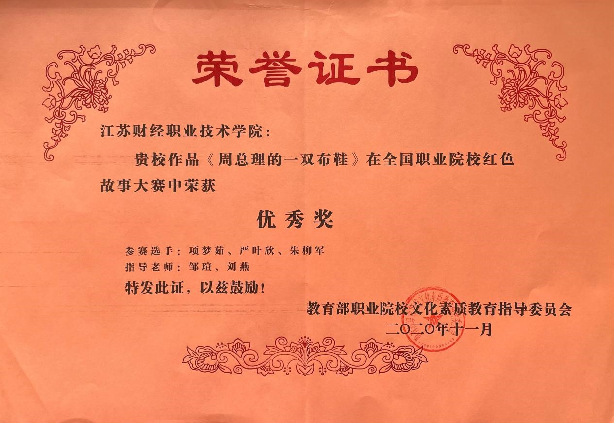 12月5日,全国职业院校红色故事大赛颁奖会圆满落幕。由我校项梦茹、严叶欣、朱柳军三位同学合作,邹瑄、刘燕老师指导的视频作品《周总理的一双布鞋》荣获优秀奖。