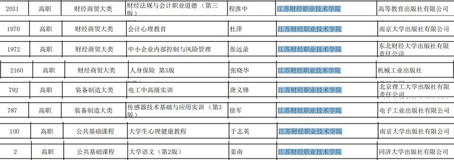 近日,根据《教育部办公厅关于公布“十三五”职业教育国家规划教材书目的通知》(教职成厅函〔2020〕20号)公布,我校《财经法规与会计职业道德(第3版)》(程淮中主编,高等教育出版社有限公司)、《会计心理教育》(杜萍主编,南京大学出版社有限公司)、《中小企业内部控制与风险管理》(张远录主编,东北财经大学出版社有限责任公司)、《人身保险(第3版)》(张晓华主编,机械工业出版社)、《电工中高级实训》(唐义锋主编,北京理工大学出版社有限责任公司)、《传感器技术基础与应用实训(第3版)》(徐军主编,电子工业出版社有限公司)、《大学生心理健康教程》(于志英主编,南京大学出版社有限公司)、《大学语文(第2版)》 (姜南主编,同济大学出版社有限公司)等8部教材成功入选。