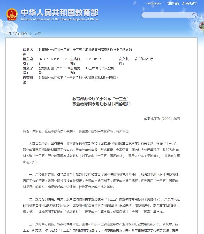以上入选的“十三五”职业教育国家规划教材,遵循技术技能人才成长规律,坚持知识传授与技术技能培养并重,将专业精神、职业精神和工匠精神融入教材内容;强化行业指导、企业参与,广泛调动社会力量参与教材建设,注重吸收行业企业技术人员、能工巧匠等深度参与教材编写,反映典型岗位(群)职业能力要求;围绕深化教学改革和“互联网+职业教育”发展需求,探索教材配套资源开发和信息技术应用,本着精益求精的原则充分发挥教材铸魂育人作用。