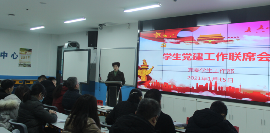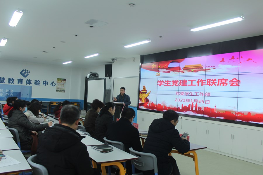 1月15日下午,学校在智慧商科组织召开学生党建工作联席会。学校党委副书记嵇芹珍,副校长梁枫,党委组织部、党委宣传部、党委教师工作部、党委学生工作部、党委保卫部、团委负责人,二级学院党总支副书记、学生党支部书记参加本次会议。会议由党委学生工作部部长朱绍勇主持。