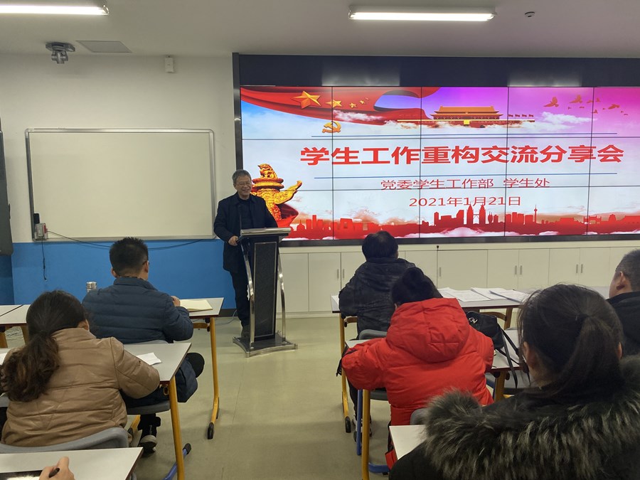 1月21日下午,学校在智慧商科组织召开学生工作交流分享会。学校党委委员、副校长梁枫,党委学生工作部(学生处)、党委保卫部(保卫处)、团委负责人,二级学院党总支副书记、全体专职辅导员参加本次会议。会议由党委学生工作部部长朱绍勇主持。