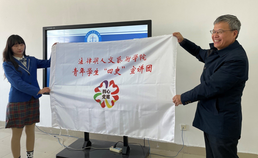 蒋淮阳宣读中共江苏财经职业技术学院法律与人文艺术学院总支委员会《关于成立法律与人文艺术学院青年学生“四史”宣讲团的决定》。梁枫为青年学生“四史”宣讲团授旗。