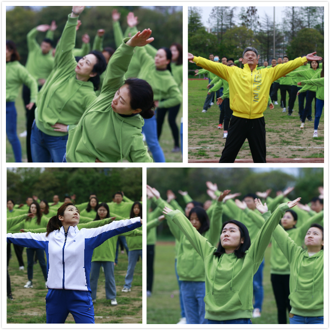 随后,150名教职工进行工间操展演,大家穿着统一的服装,踏着动感的节拍,以整齐规范的动作、热情洋溢的笑容、充满自信的姿态,赢得现场阵阵掌声,展现了我校职工饱满的活力和积极向上的精神风貌。本次展演的工间操是国家体育总局推广普及的第九套广播体操,展演旨在进一步激发全校教职工干事创业的积极性、主动性、创造性,动员教职工加强体育锻炼,提高身体素质,发扬拼搏精神,在各自岗位上奋发进取、创新实干,以阳光向上、充满活力的精神状态在党的各项事业中走在前列、争作表率。