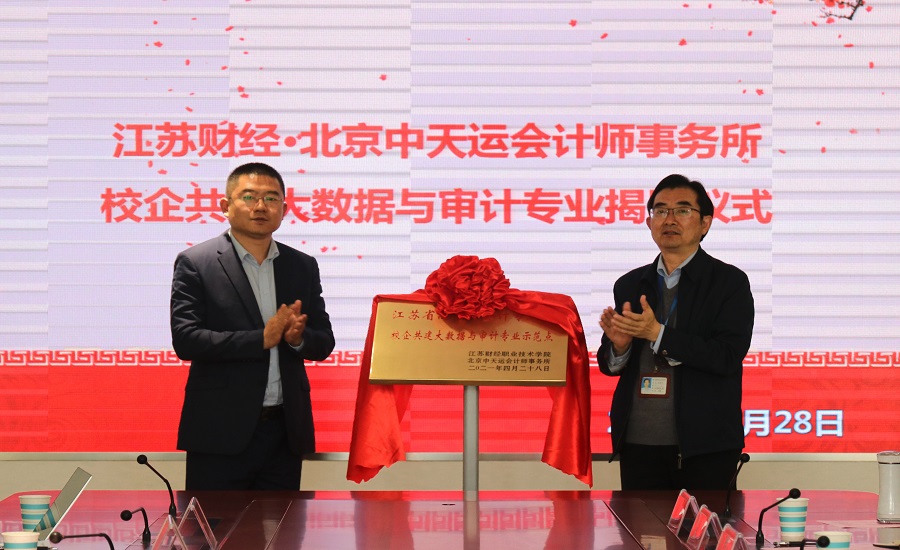 程淮中与事务所合伙人应文杰为校企合作共建的大数据与审计专业示范点揭牌,院长张卫平与应文杰签订了战略合作协议。