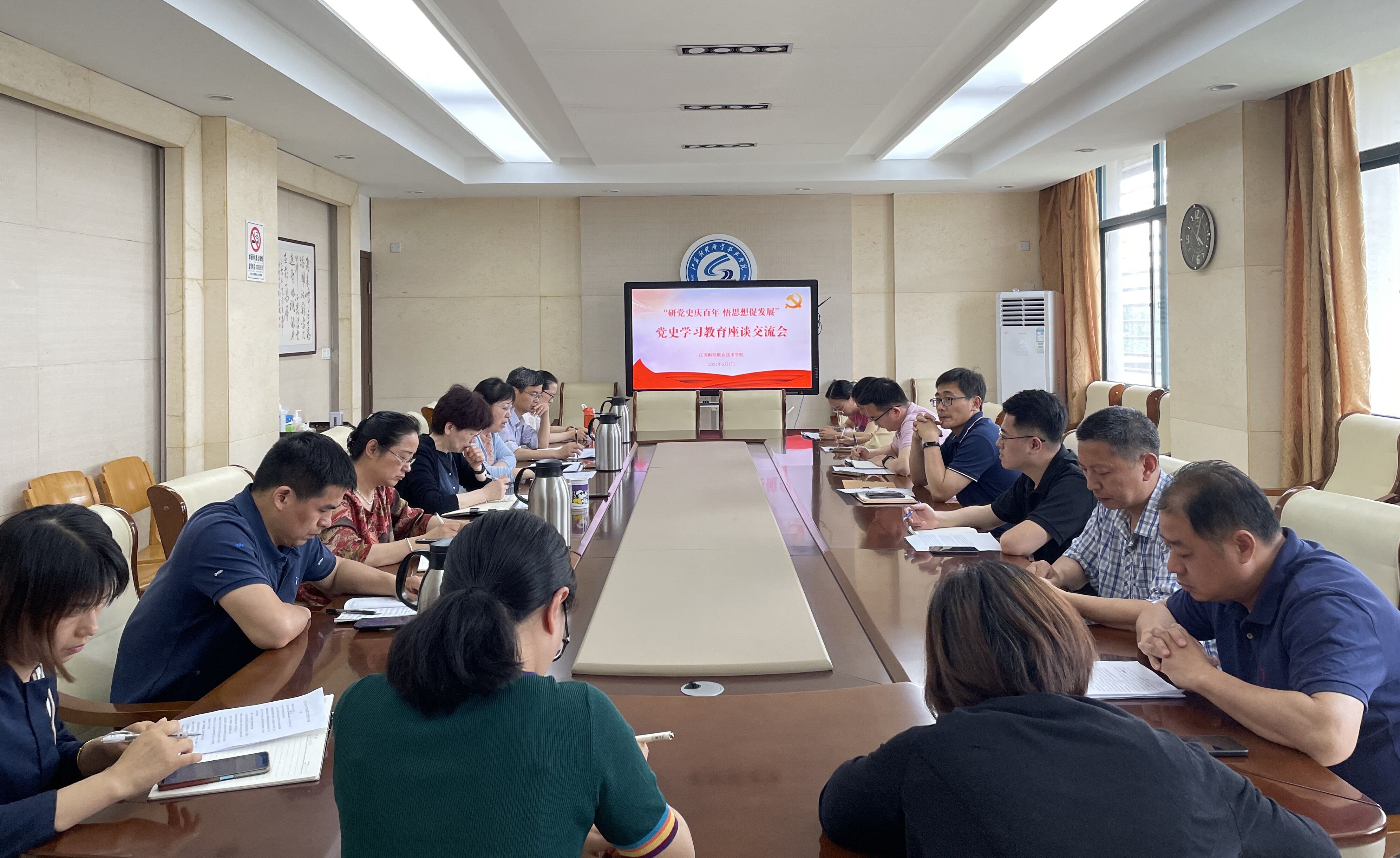 6月1日下午,学校“研党史庆百年 悟思想促发展”党史学习教育座谈交流会在明德楼310会议室举行。学校党史学习教育办公室主任、党委副书记嵇芹珍出席会议并讲话。党委宣传部、科技处、马克思主义学院负责人以及学校党史研究专项科研项目、思想政治工作精品项目部分申报负责人参加了座谈交流。会议由党史学习教育办公室副主任、党委委员、宣传部部长邹瑄主持。