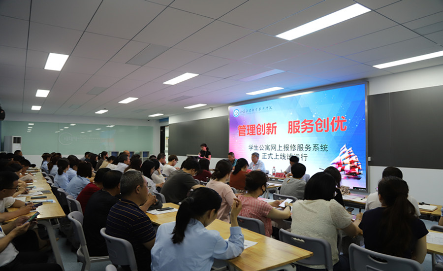为持续推进“管理创新、服务创优”向基层一线拓展和延伸,不断提高智慧管理和智慧服务水平,6月22日下午,学生处、总务处联合在智慧商科体验中心举行学生公寓网上报修服务系统正式上线试运行会议。学校副校长梁枫、学生处、总务处主要负责人,各二级学院党总支副书记、总务处和学生处相关负责老师、全体专职辅导员及学生代表参加了会议。会议由党委学工部部长、学生处处长朱绍勇主持。