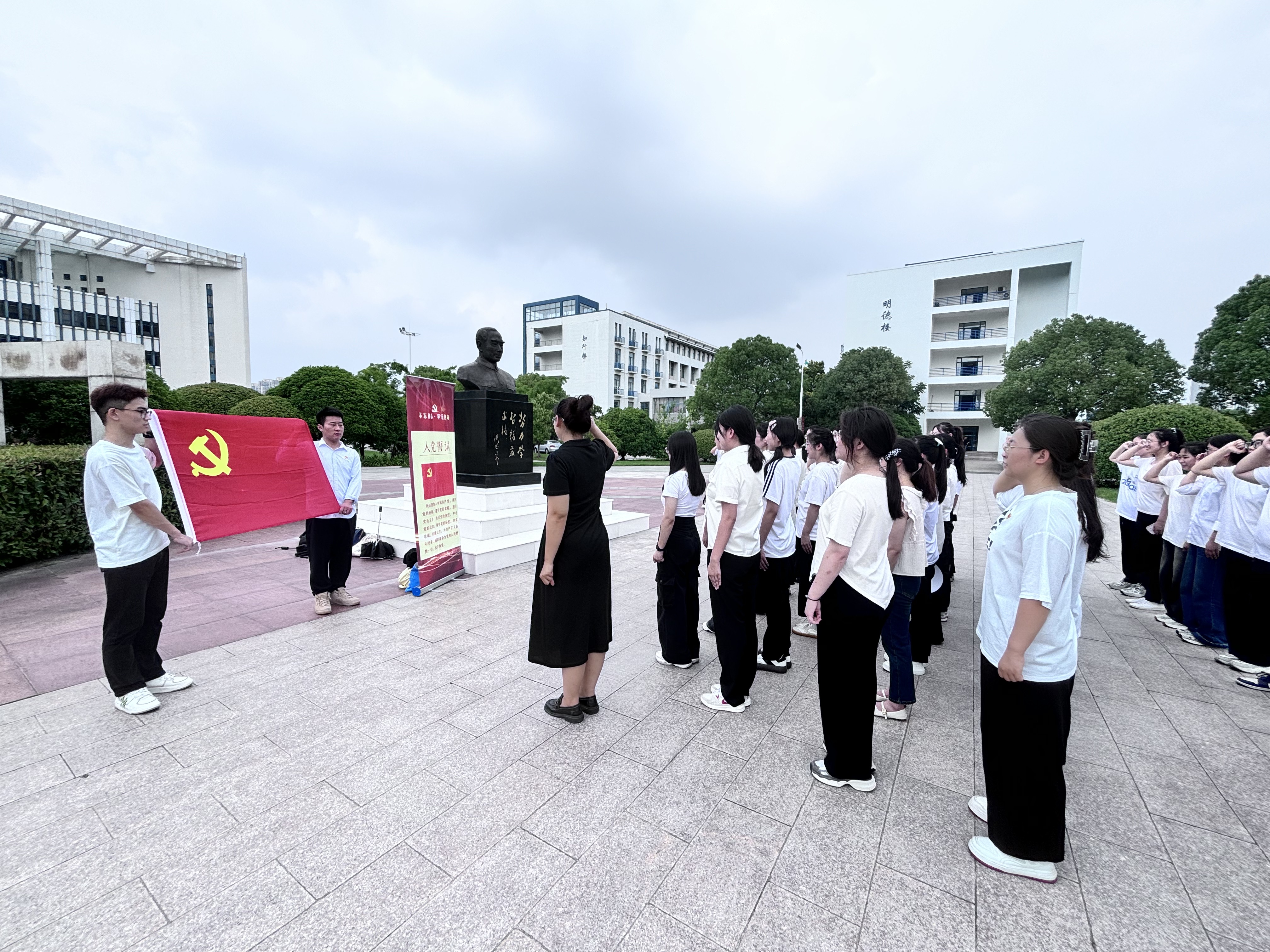 “出发!”在鲜红旗帜的引领下,大家齐唱红色革命歌曲,走在致远路上,追寻那段不凡的红色记忆。路上共设四个关卡,“学党史”“明党纪”“壮体魄”“强党性”,在各个关卡同学们积极参与,抢着答题,争夺第一。休息间隙,学生党员为大家讲述红色故事。在翔宇文化广场, 全体党员列队,面对鲜红党旗举起右手庄严宣誓,重温入党誓词,再次表达不忘初心、牢记使命的决心。