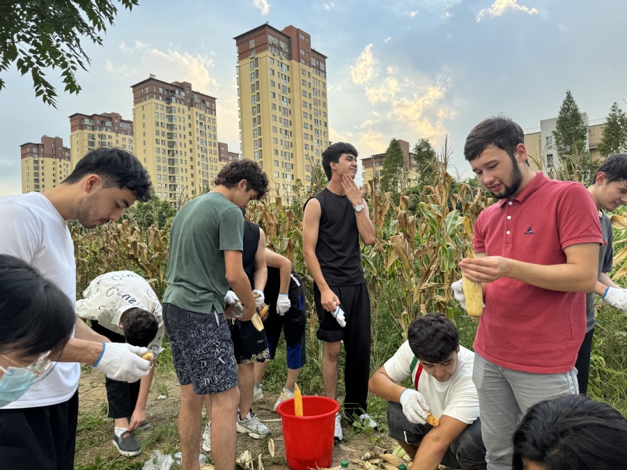 经过1小时的努力奋斗,同学们圆满完成了整片劳动田的采摘任务。师生们早已个个一脸汗水,一腿蚊子包,但是脸上都绽放着喜悦的笑容。稍事休整后,在老师的组织下,同学们将摘下的玉米剥去外衣,保存装袋。参与此次劳动的一位塔吉克斯坦留学生表示:“摘玉米时非常有成就感,还在劳动中学会了’玉米’这个新词语,非常开心!”