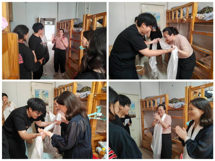 新生们对老师们的到来表示热烈欢迎,并表达了对大学生活的期待。马栎老师为每位同学普及了宿舍安全用电知识和学生公寓违纪处理条例,并为新生宿舍送上了学院定制的中药驱蚊香囊。在走访少数民族同学宿舍时,西藏同学为老师献上了哈达以表感谢与尊敬,师生之间的情谊在此刻得到了升华。