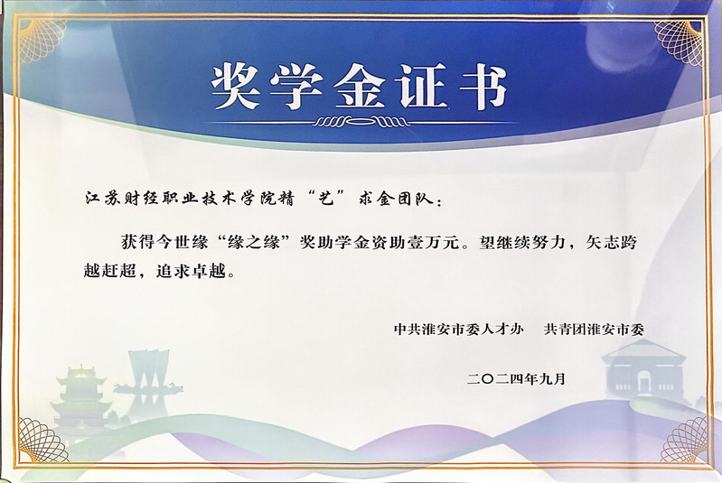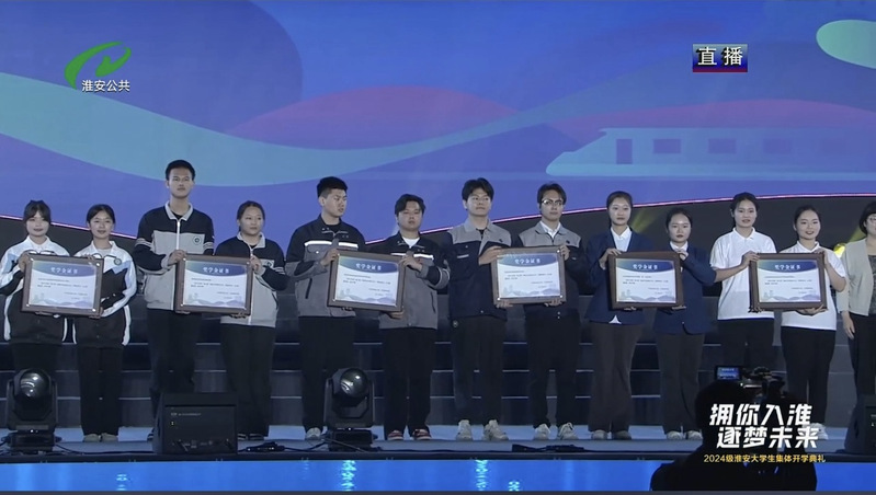 金秋九月,青春飞扬。9月27日晚,“拥你入淮 逐梦未来”2024级淮安大学生集体开学典礼在江苏财经职业技术学院举行。徐瑞、郁文静两位同学作为2023年全国职业院校技能大赛“智慧金融”赛项精“艺”求金团队优秀代表上台领奖。