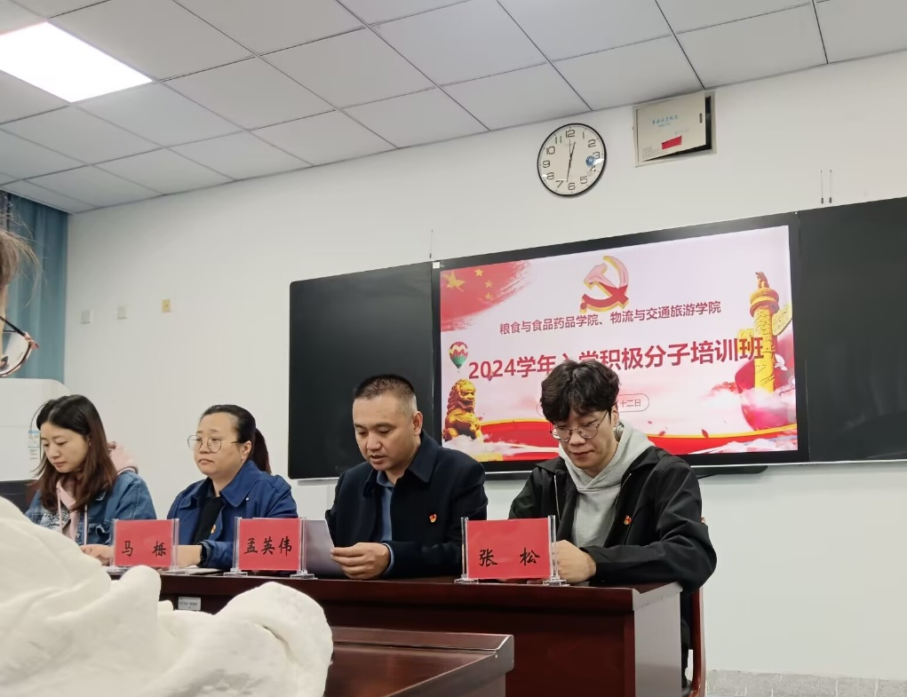 为引领广大青年学生永远跟党走、奋进新征程,引导大学生学习党史,了解党情,认识入党的初心。10月22日,粮食与食品药品学院、物流与交通旅游学院在诚行楼417联合开展2024年下半年入党积极分子培训班开班仪式。粮食学院党总支副书记马栎、物流学院党总支副书记孟英伟,物流学院学生党支部书记张松,粮食学院学生党支部书记朱羽及全体入党积极分子参加此次开班仪式。