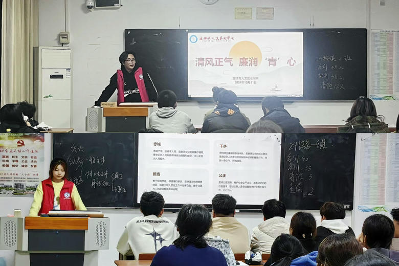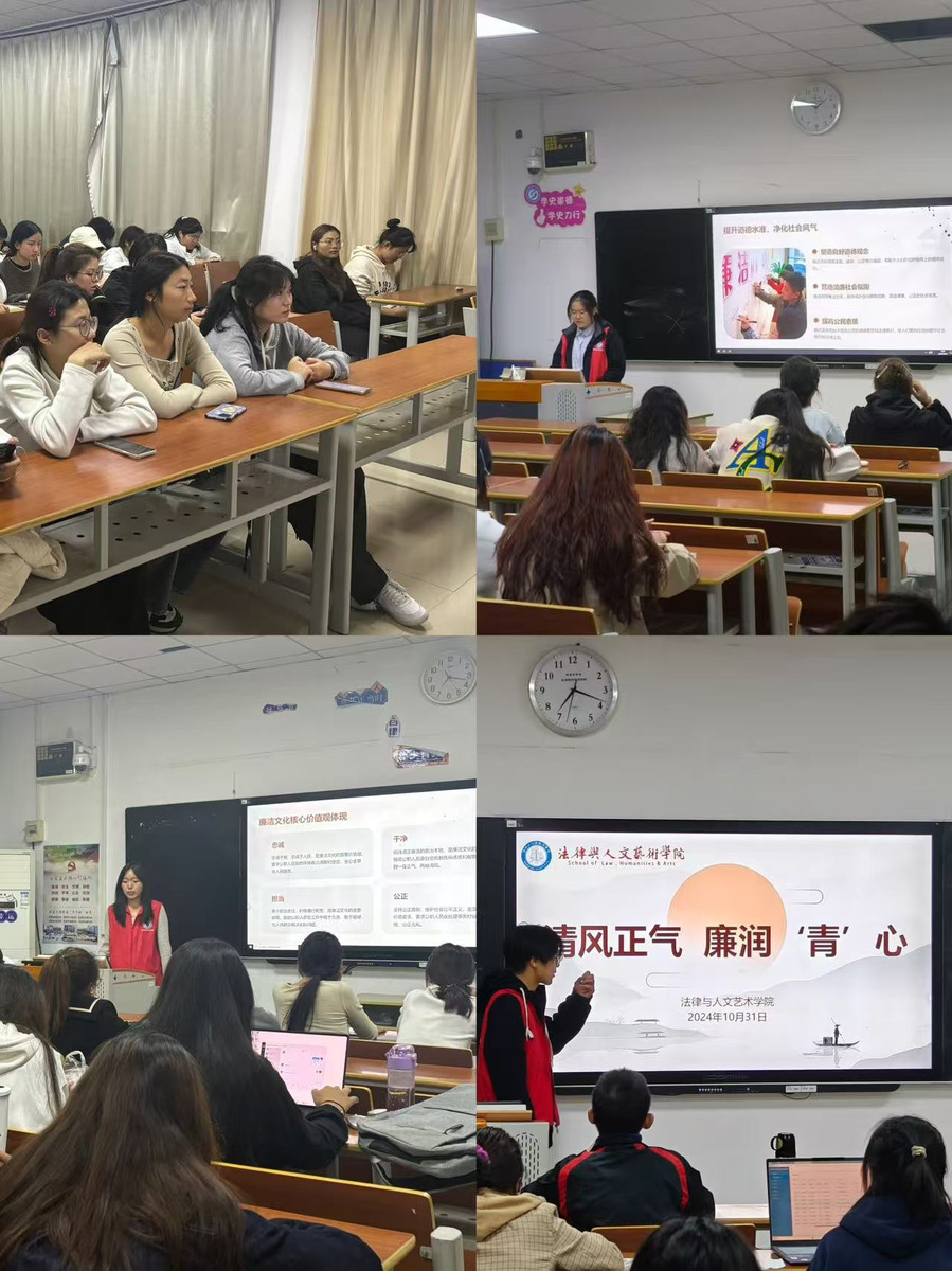 为进一步深化廉洁文化建设,教育引导学生树立清正廉洁思想意识,营造校园廉洁文化氛围,10月31日晚,法律与人文艺术学院社会实践部志愿者们走进学院全体新生班级开展“清风正气,廉润青心”宣讲活动。