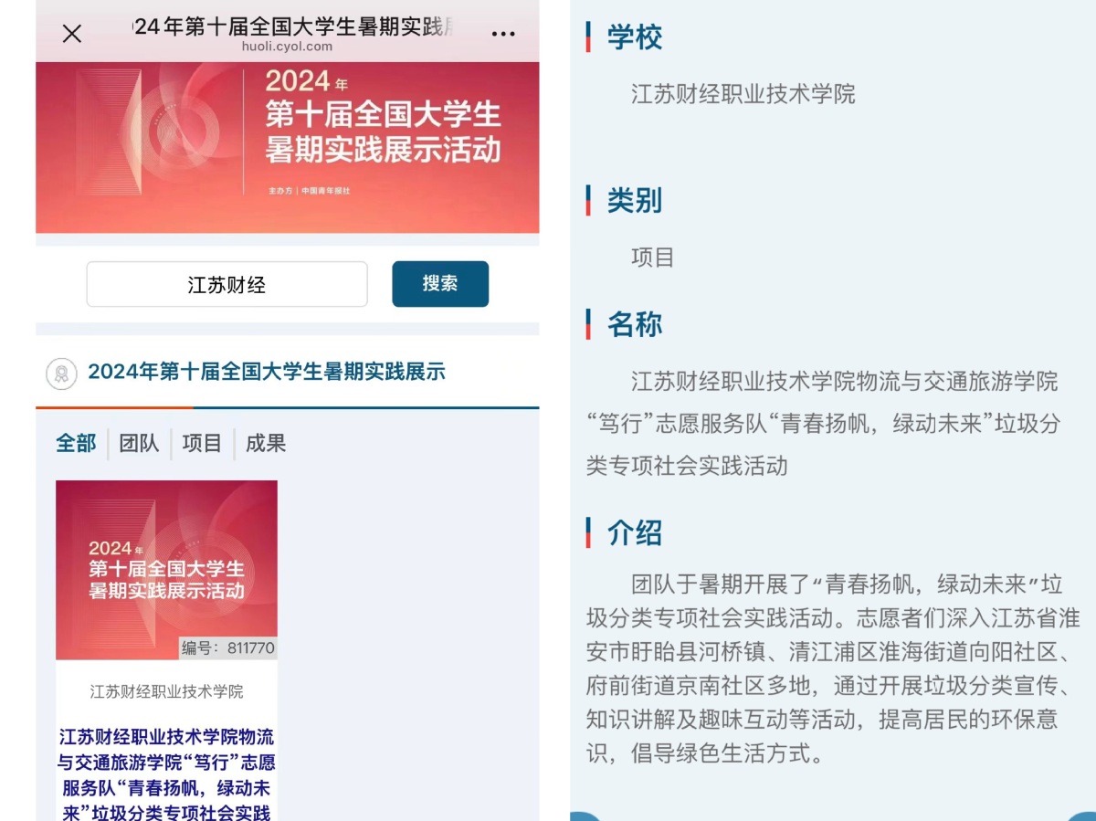 为深入贯彻习近平总书记关于“绿水青山就是金山银山”理念,我院“笃行”志愿服务队在暑期开展了“青春扬帆,绿动未来”垃圾分类专项社会实践活动。志愿者们深入江苏省淮安市盱眙县河桥镇、清江浦区淮海街道向阳社区、府前街道京南社区多地,通过开展垃圾分类宣传、知识讲解及趣味互动等活动,提高居民的环保意识,倡导绿色生活方式。志愿者们深入到社会的各个角落,用青春的脚步丈量大地,以实际行动践行社会责任。