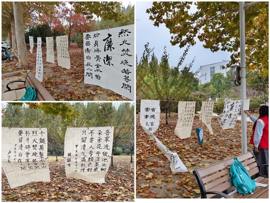 活动分为软笔书法和硬笔书法两类。活动现场井然有序,同学们纷纷停下脚步,拿起现场准备的笔和纸,参与到本次活动中来。大家认真的神情与景观大道的秋景相得益彰,吸引了众多师生驻足。他们全神贯注,一撇一捺尽显书法功底,每一个字都蕴含着对清廉的赞颂。“有德言能立 无求品自高 做人常律己 正气贯云霄”、“人以廉为尊,水以清为贵”、“清如秋菊何妨瘦 廉似梅花不畏寒”……一句句廉洁警句、一片片赞扬廉洁的诗文,抒发了同学们对廉洁文化的认识、理解和思考。