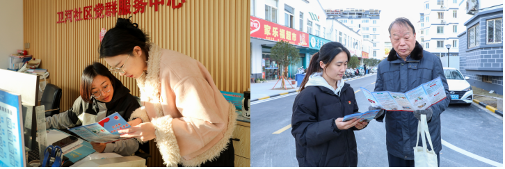 社区广场上,大学生党员学习习近平新时代中国特色社会主义思想联合会的学生志愿者向社区居民分发中国共产党人精神谱系、全民阅读倡议书等宣传手册。新风社的学生志愿者为社区居民发放装有红色经典书籍的阅读书袋,满足群众的精神文化需求,丰富社区居民的文化生活。