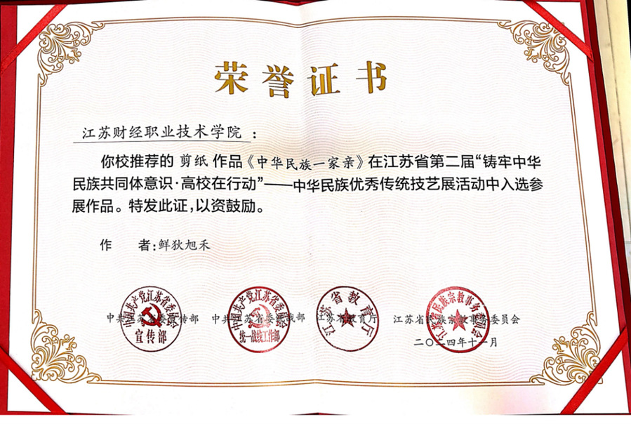 11月6日下午,由省委宣传部、省委统战部、省教育厅、省民宗委主办的江苏省第二届“铸牢中华民族共同体意识·高校在行动”知识竞赛决赛暨总结大会在苏州大学举行。“学习会”学生党员鲜狄旭禾剪纸作品《中华民族一家亲》入选中华民族优秀传统技艺展参展作品。
