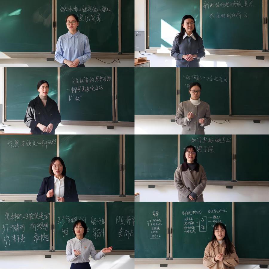 教学展示活动中,丁蓉蓉老师以《绿水青山就是金山银山》为题,介绍了这一理念的提出背景、分析了绿水青山和金山银山两者的关系以及处理好两者关系需把握的原则和方法。宋婧文老师以《新时代呼唤担当民族复兴大任的时代新人》为题,讲述了毛泽东同志立志明德成才担任的故事,呼唤青年大学生做勇担复兴大任的时代新人。苑晓丽老师以《文化自信的底气来源——中华优秀传统文化》为题,从历史性、民族性、先进性三个角度分析了坚定文化自信的重要性,得出必须守住中华优秀传统文化这一根脉的结论。王瑶老师以《两个确立的决定性意义》为题,从理论、历史、现实三个方面讲述了两个确立背后所蕴含的决定性意义,引导青年学生要加强理论学习,站稳政治立场,为实现中华民族伟大复兴跑出青春的“加速度”。