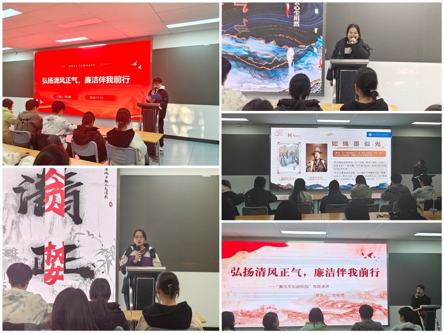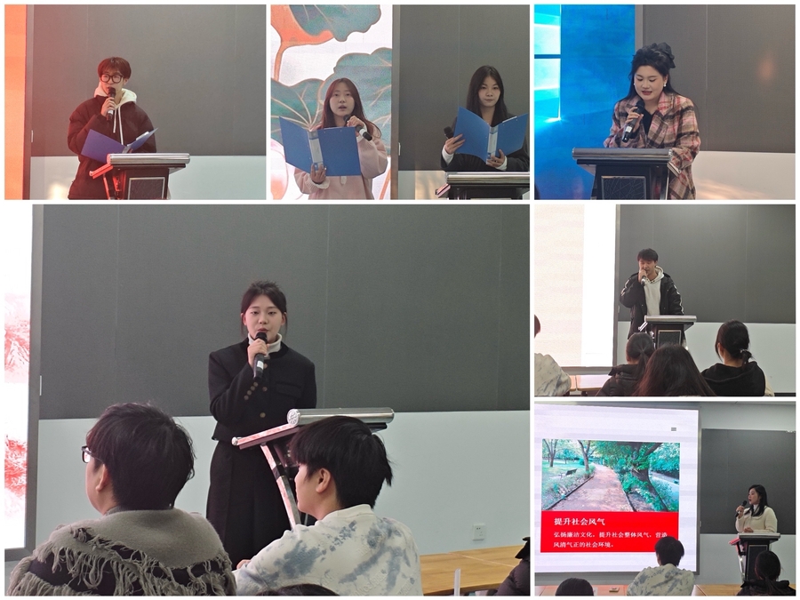经过初赛的激烈选拔,十支队伍汇聚决赛舞台。演讲现场他们从历史人物的清正廉洁事迹说起,阐述廉洁美德在岁月长河中的传承与价值;从当下社会现象聚焦,表达对廉洁奉公、坚守正道的深刻理解与坚定信念;从贪腐数据分析着手,剖析贪腐案例的危害和严重后果……选手们声情并茂、引经据典,侃侃而谈,在这里古今廉洁文化碰撞出新的火花,同学们用自己的语言讲好每一个廉洁故事,抒发着廉洁的号召,传递着廉洁的力量,用自身行动呼吁身边学子以廉洁为底色,扬廉洁之帆,启青年之路,写青春篇章。