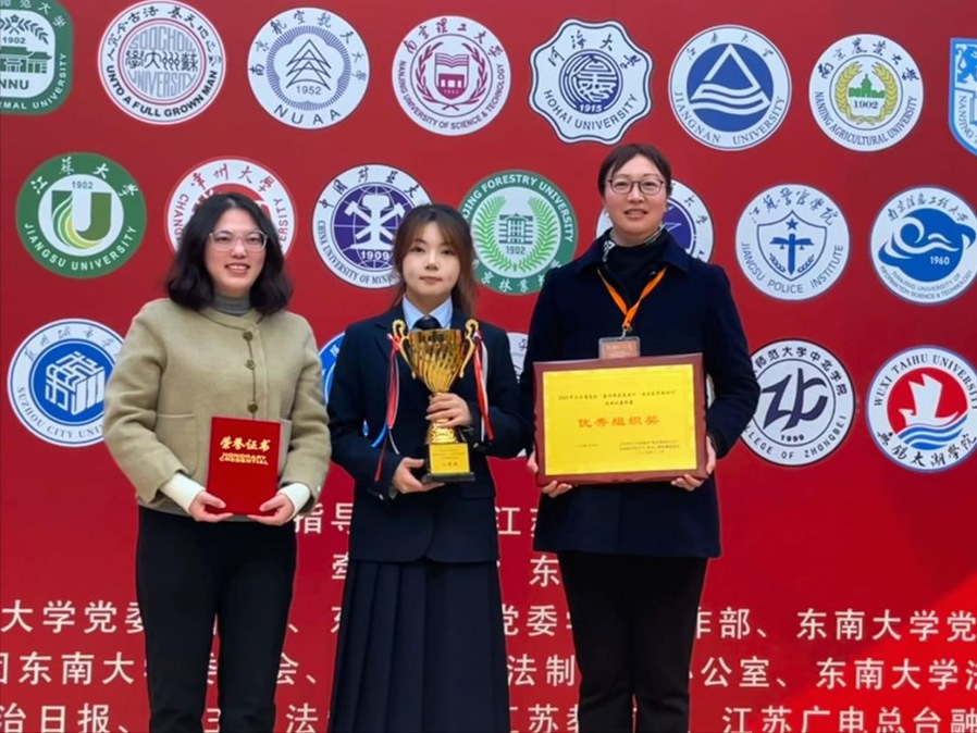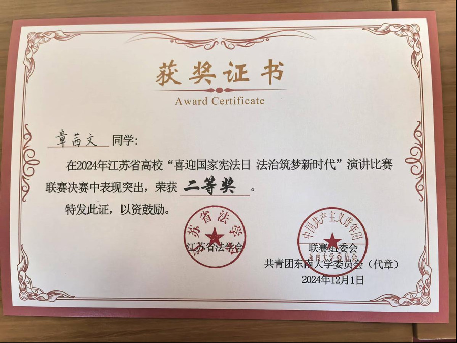 12月2日,在第十一个“国家宪法日”来临之际,由江苏省法学会主办、东南大学承办的2024年江苏省高校“喜迎国家宪法日 法治筑梦新时代”演讲比赛(决赛)在东南大学拉开帷幕。来自南京大学、东南大学、南京师范大学、南京航空航天大学、南京理工大学、江苏警官学院等十七所高校的十七支代表队同台竞技,我院24级法律事务专业3班章茜文同学,作为该项赛事唯一入围的专科学生,历经网络初赛、现场决赛两轮筛选,以其对宪法的深刻理解和优异的现场表现脱颖而出,荣获二等奖。学院获评“优秀组织奖”。