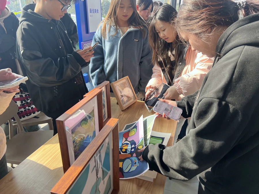 所有作品由视觉美育社团学生精心绘制,内容涵盖了静物、自然风光、校园生活、抽象艺术等多方面,每一幅都凝聚着创作者的心血和才华,表达着学生们对校园美景的欣赏和热爱,也承载着心中的美好愿景和对生活的独特感悟。画作立意新颖、色彩斑斓,经过精美装裱,更加引人注目。活动面向全校学生,不议价、不收费,不少学生从宿舍拿来各式各样的小物件,跟社团“摊主”沟通交流,直接换取心仪画作。秋意未尽、初冬乍寒,但活动现场气氛温馨而热烈,为创造美、欣赏美、感受美、传递美提供了一个很好的平台。