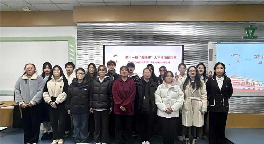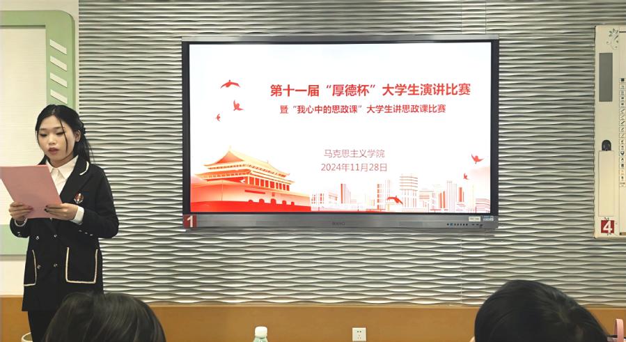 为深入学习党的二十大和党的二十届三中全会精神,推动习近平新时代中国特色社会主义思想进教材进课堂进学生头脑,进一步加强思政课实践教学,充分调动大学生学习思政课的积极性、主动性和创造性,有效提升对思政课的参与度和获得感,不断增强做中国人的志气、骨气、底气,11月28日下午,马克思主义学院举办的“第十一届‘厚德杯’大学生演讲比赛暨‘我心目中的思政课’大学生讲思政课比赛”在学校文渊楼205教室隆重举行。