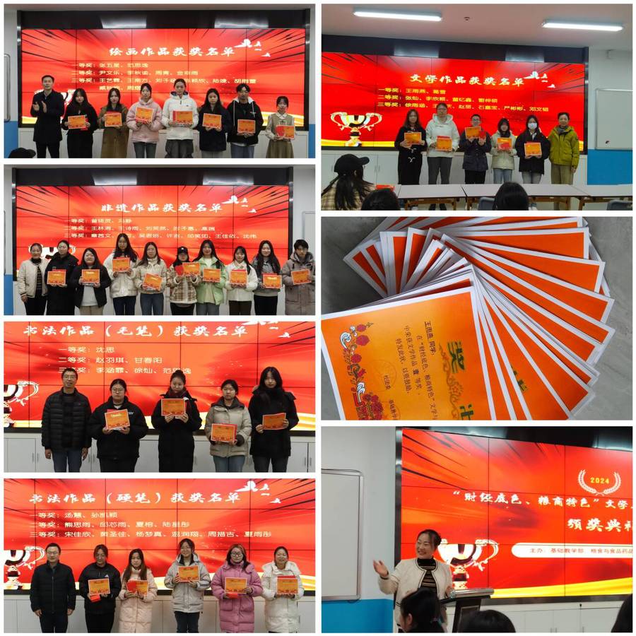 12月13日下午,文汇楼102智慧教室里欢声笑语、掌声不断,由基础教学部、粮食与食品药品学院、校团委共同举办的文学与美育作品征集活动举行颁奖仪式,来自全校各院系的获奖者获得了奖状和定制奖品。粮食与食品药品学院院长田林双、基础教学部党总支书记赵燕、校团委书记王亚南、基础教学部公共艺术教研室主任顾劲松等出席了仪式并为获奖者颁奖。