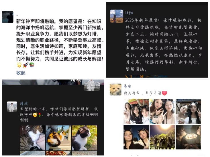 在创意视频展示环节,同学们通过Vlog、微电影、动画等新颖形式,分享了过去一年的成长与收获,展望了新年的美好愿景,展现了同学们的无限创意和青春风采。在新年愿望墙环节,同学们纷纷在各新媒体平台发表新年愿望,内容涵盖学习目标、职业规划、生活愿景等多个方面,表达了为实现梦想而努力奋斗的决心和信心,字里行间洋溢着对未来的美好期待。