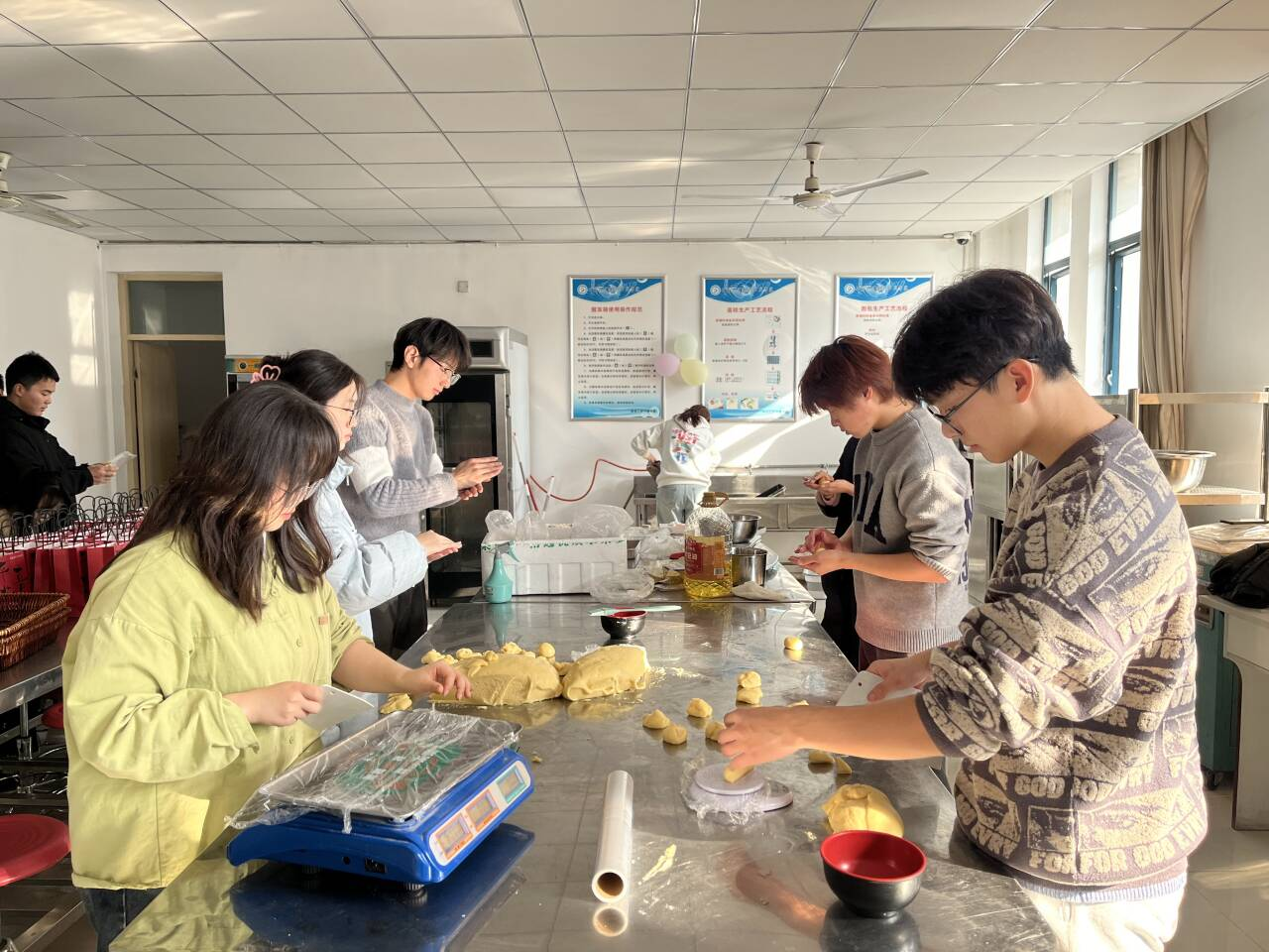 活动当天,烘焙社成员及志愿者们早早来到了活动现场,在指导老师董静、诸葛尧尧、朱羽的组织下,大家分工明确,有的负责准备原材料,有的负责烘焙制作,还有的负责包装和送达。