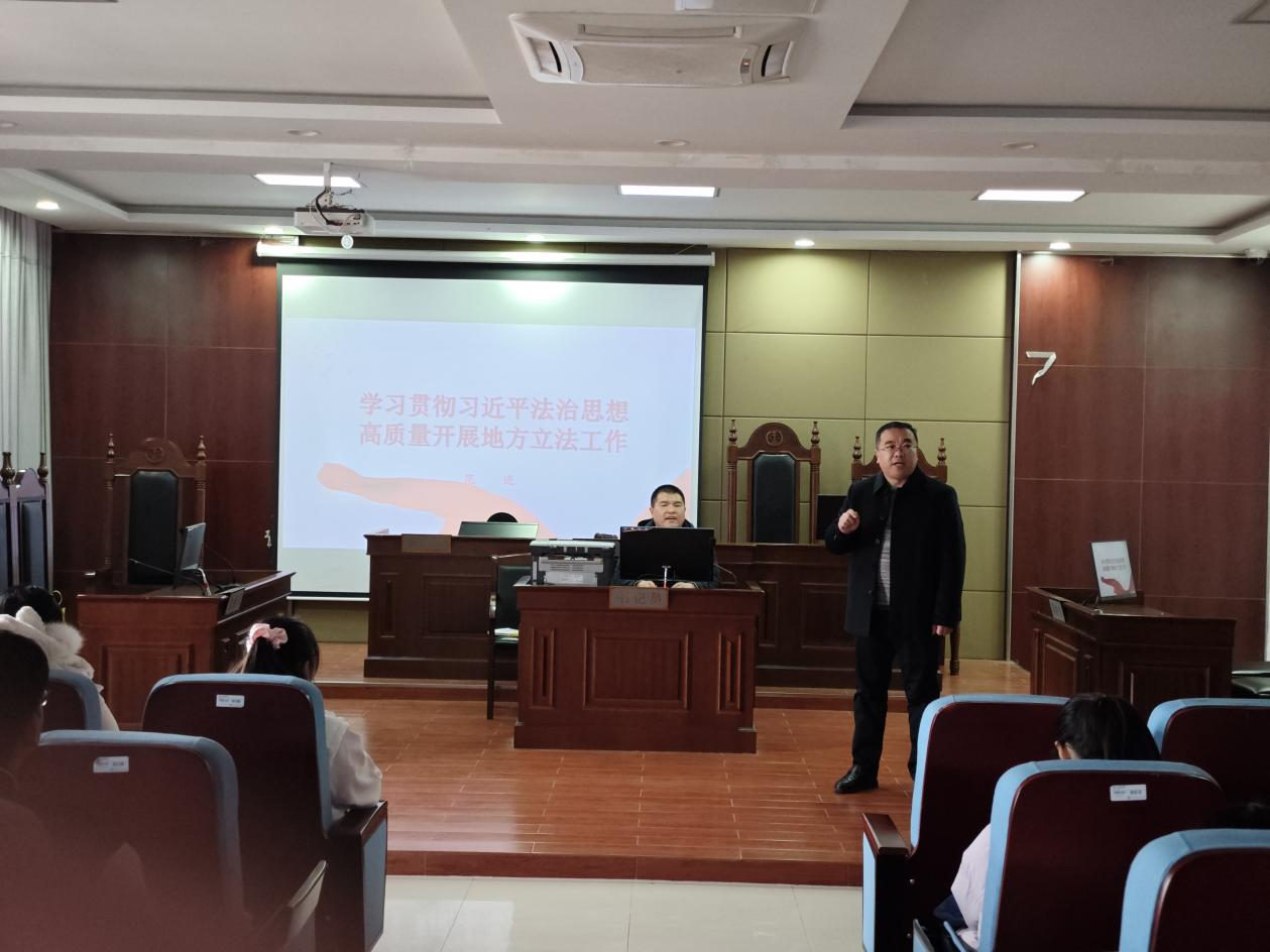 讲座伊始,范进深入阐述了习近平法治思想在新时代科学立法中的重要地位,指出党的十八大以来,以习近平同志为核心的党中央高度重视立法工作,习近平总书记对新时代科学立法的目标方向、任务要求、重要原则、体制机制等进行了全面阐述,为新时代坚持科学立法提供了根本遵循。范处长通过回顾2014年中共十八届四中全会、2020年中央全面依法治国工作会议、2021年中央人大工作会议以及2021年12月6日中共十九届中央政治局集体学习等重要会议和学习内容,详细解读了习近平法治思想在立法工作中的具体体现,强调了加强宪法实施和监督、推进合宪性审查工作、明确立法权力边界、加强重点领域立法等关键要点。
