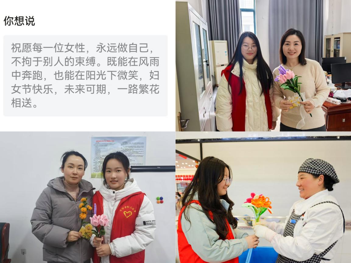 值得一提的是,志愿者们还匠心独运地准备了别样惊喜:巧手制作的扭扭棒永生花束绽放着春日气息,手绘贺卡上真挚的祝福话语墨香犹存。当这些心意之作被送至女教师和后勤女职工手中时,绽放的笑颜与声声谢意交织成最美风景线。学院更同步启动"芳华寄语"云端征集活动,通过QQ小程序搭建祝福传递平台,短短两日便收获三百余条暖心留言,将感恩教育浸润在字里行间。