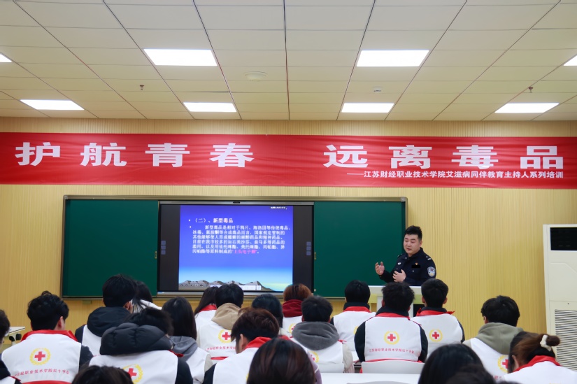 为做好江苏省高校艾滋病同伴教育主持人基地建设,深入推进“健康校园”系列活动,3月15日下午,学校团委和红十字会在大学生五育融合发展中心开展“护航青春 远离毒品”禁毒宣传教育活动。活动邀请我校2009届优秀校友,盱眙县禁毒大队教导员(主持工作)顾皓为主讲人,50余名学生志愿者骨干参加活动。