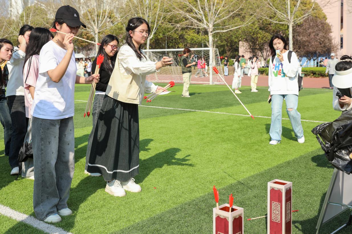 随后,同学们纷纷走向操场,积极参与到“一起‘趣’”户外活动中。活动共设置了“蛇来运转”、“健康‘腰’约”、“稳中求胜”、“光盘行动”、“活力毽球”、“并肩同行”等趣味项目。新颖有趣的活动形式,吸引了近千余名学生参与。他们在阳光明媚的春日里畅快运动,释放压力,尽显激情与活力。