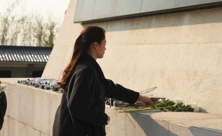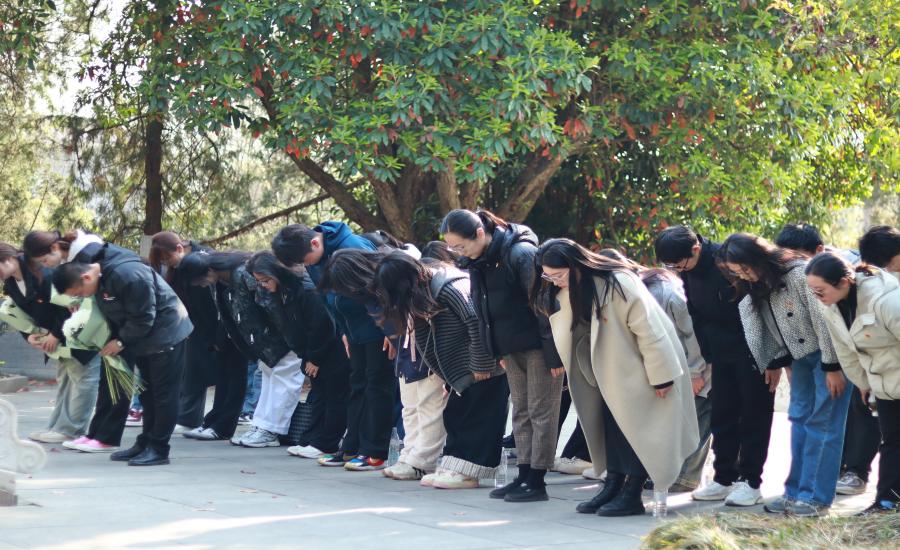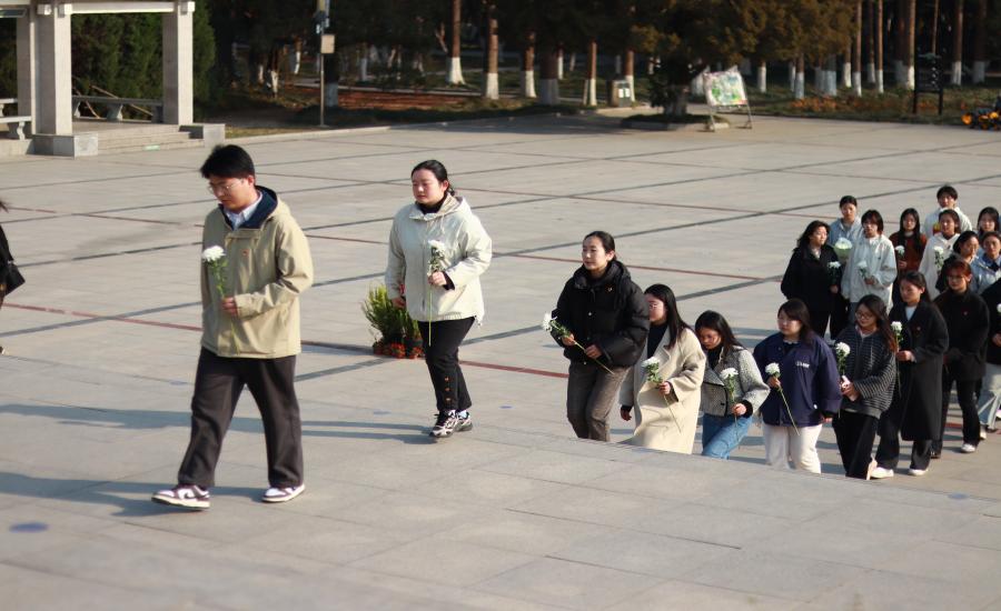 随后,在八十二烈士纪念碑前举行了庄严的纪念仪式。全体师生垂首肃立,向长眠于此的烈士默哀三分钟,深切缅怀革命先烈的丰功伟绩;默哀毕,师生手持白菊依次缓步走向纪念碑,敬献鲜花并瞻仰碑文;最后,全体向烈士行三鞠躬礼,以最质朴的仪式表达无限追思与崇高敬意。