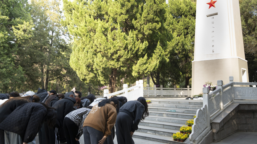 随后,师生们环绕象征八十二位烈士的82 棵苍翠青松,聆听讲解员动情讲述群众自发掩埋烈士遗骸的感人历史,在庄严肃穆的氛围中,大家对先烈们的敬意愈发深沉。在烈士纪念碑前,全体师生整齐肃立,低头默哀,向革命先烈致以最崇高的敬意。