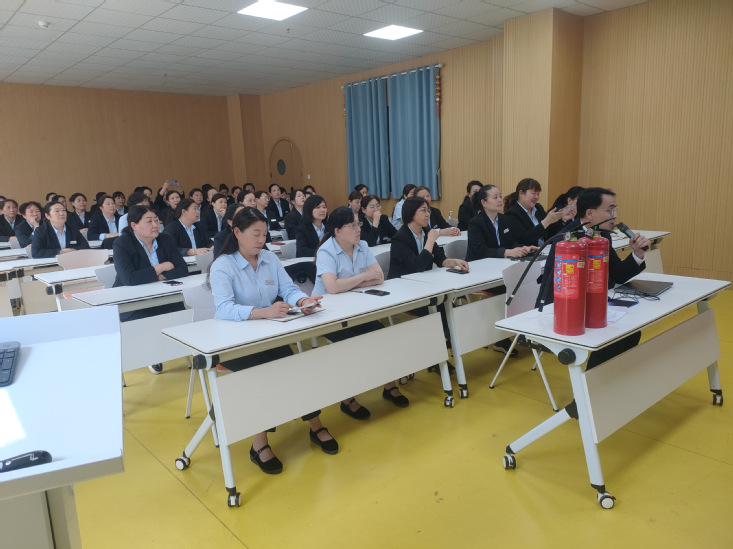 培训环节,物业礼仪讲师吴婷讲解物业人员在日常工作中的礼仪规范,包括仪容仪表、言行举止、沟通技巧等内容,结合学生公寓服务场景,分析不同场景下的礼仪要点,如与师生交流、处理投诉等。消防安全讲师通过高校火灾典型案例分析,系统讲解消防设施操作、应急疏散指挥等标准化流程,并针对如何正确使用灭火器进行了实操演练。