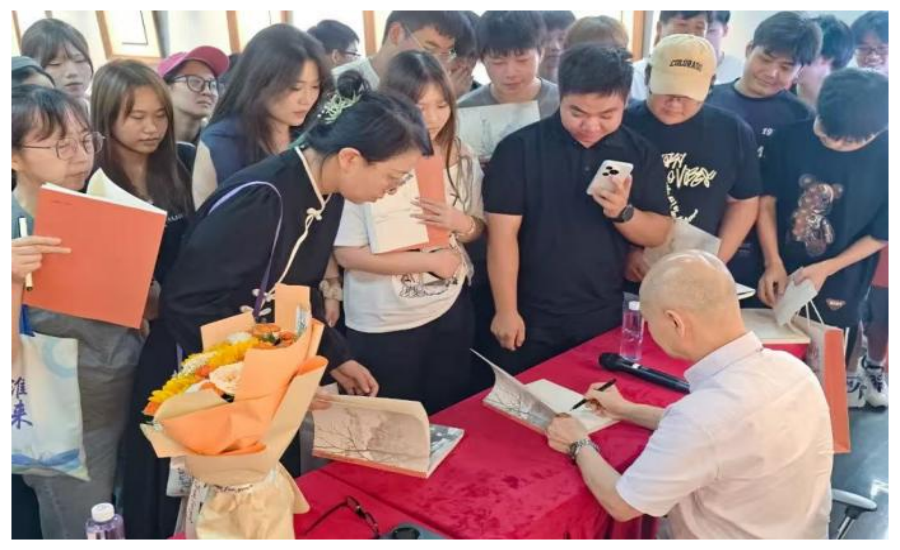 交流环节,学生围绕“写生中如何发现生活之美”“怎样通过画笔传递内心感受”等问题踊跃提问。深耕美术教育与创作多年的毕宝祥先生,结合自身经历,既从专业角度拆解“观察与表达”的写生技巧,更以“艺术源于生活,美育滋养心灵”为核心,分享创作中融入美之感知与思考的方法。他还以展出的山水作品为例,详解如何从普通自然场景中提炼审美元素,鼓励学生在日常生活中多观察、多感受,让美育真正融入生活。