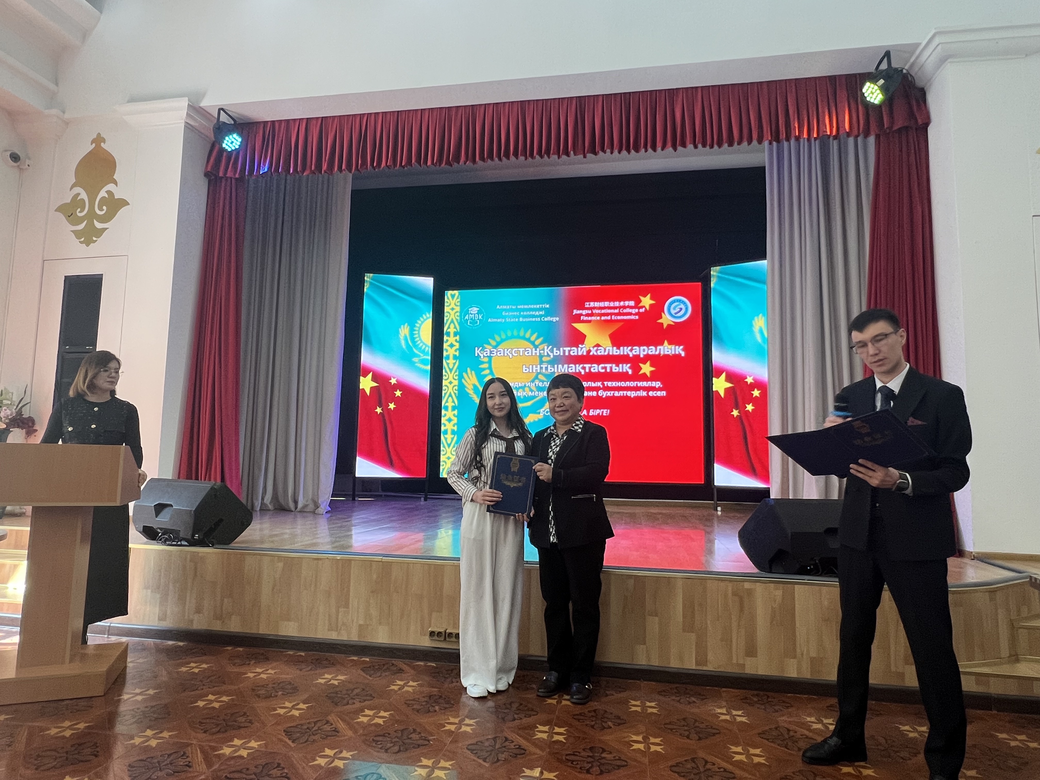 9月25日上午,我校中国-哈萨克斯坦应用技术学院海外培训中心揭牌暨结业仪式在阿拉木图国立商学院报告厅隆重举行。阿拉木图国立商学院校长穆卡詹诺娃·阿依努尔,我校党委副书记杜萍,国际教育学院院长冯伟,三位授课教师,以及哈方师生代表等二百余人参加了仪式。