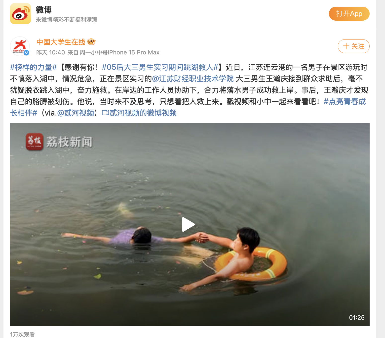 #榜样的力量#【感谢有你!#05后大三男生实习期间跳湖救人#】近日,江苏连云港的一名男子在景区游玩时不慎落入湖中,情况危急,正在景区实习的@江苏财经职业技术学院 大三男生王瀚庆接到群众求助后,毫不犹疑脱衣跳入湖中,奋力施救。在岸边的工作人员协助下,合力将落水男子成功救上岸。事后,王瀚庆才发现自己的胳膊被划伤。他说,当时来不及思考,只想着把人救上来。戳视频和小中一起来看看吧!#点亮青春成长相伴#(via.@贰河视频)