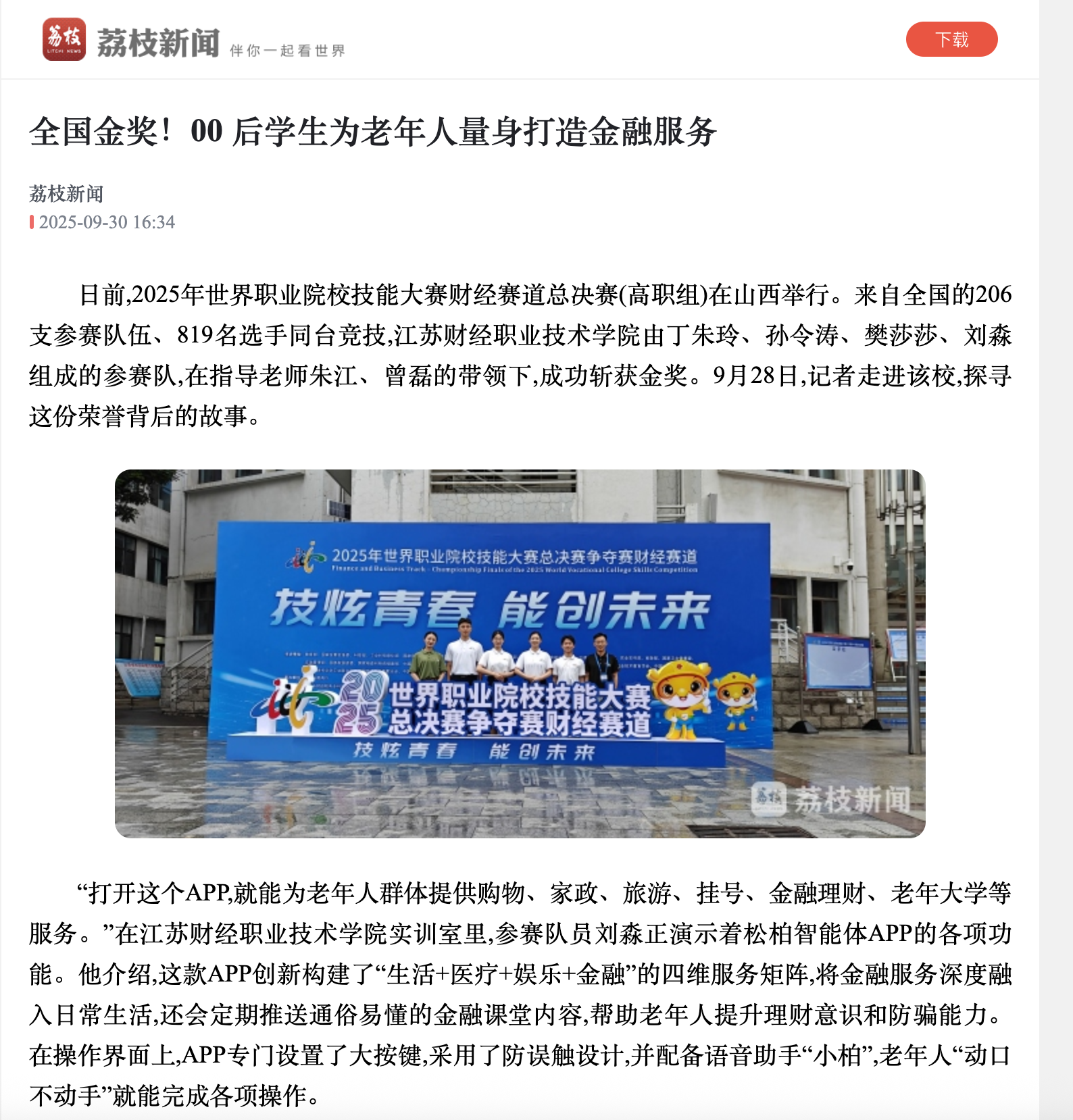 日前,2025年世界职业院校技能大赛财经赛道总决赛(高职组)在山西举行。来自全国的206支参赛队伍、819名选手同台竞技,江苏财经职业技术学院由丁朱玲、孙令涛、樊莎莎、刘淼组成的参赛队,在指导老师朱江、曾磊的带领下,成功斩获金奖。9月28日,记者走进该校,探寻这份荣誉背后的故事。
