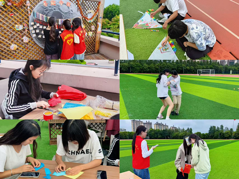 活动伊始,国庆主题活动率先拉开帷幕,现场氛围热烈。线上“我与国旗合个影”摄影大赛同步启动;线下设置“鸿运当头顶书赛”“运珠赛”“螃蟹过河”“真假抛球”“放风筝”等趣味项目,各民族同学自发组队、默契配合,在协作竞技中增进交流,既展现青春活力,更以实际行动践行民族团结,强化责任担当意识。与此同时,中秋主题活动同步推进,现场设置“巧折中秋韵”“灯谜话中秋”“月寄心愿”“中秋知多少”四大互动环节:在志愿者引导下,金融学子手持彩色卡纸制作月亮、玉兔等造型手工作品,传承传统手工艺;在灯笼展区浏览灯谜并参与解谜,通过累计积分感受传统文化与智慧的融合;在祈愿笺上书写对家人的思念与学业期许,在互动体验中深化对中秋文化的认知。