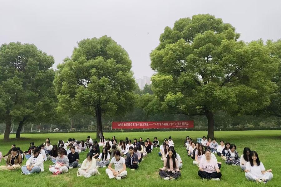 本次活动吸引了近200名学生参与,活动地点设在林荫大道旁的绿荫草地,环境舒适放松,结合 “呼吸放松 — 身体扫描 — 情绪觉察 — 正念分享” 四个核心环节,配以轻柔舒缓的音乐,确保让同学们能更快进入冥想状态。首个环节“呼吸放松”中,指导老师以温和的语调引导学生闭上眼睛,将注意力集中在呼吸上,通过“深吸气4 秒—屏息 2秒—慢呼气6秒”的节奏练习,帮助学生逐渐放下外界干扰,回归当下的身心状态。不少学生在呼吸练习中慢慢舒展眉头,原本紧绷的肩膀也逐渐放松;进入“身体扫描”环节时,指导老师逐一提示学生关注从脚尖到头顶的每一个身体部位,觉察并释放局部的紧张感,真正感受到肌肉放松后的轻松”;而在“情绪觉察”环节,老师鼓励学生不加评判地感受当下的情绪,无论是平静、愉悦,还是轻微的焦虑、烦躁,都以“接纳”的心态去面对,避免陷入对情绪的对抗或逃避,学会与负面情绪“和平共处”;最后“正念分享” 环节,学生们自愿举手交流参与感受,有同学表示“之前总觉得‘冥想’很抽象,今天体验后才发现,它其实是帮我们‘慢下来’的方法”、“和大家一起做冥想很有安全感,听到身边同学的呼吸声,感觉自己不是一个人在面对压力,这种‘同频’的感觉特别好”。