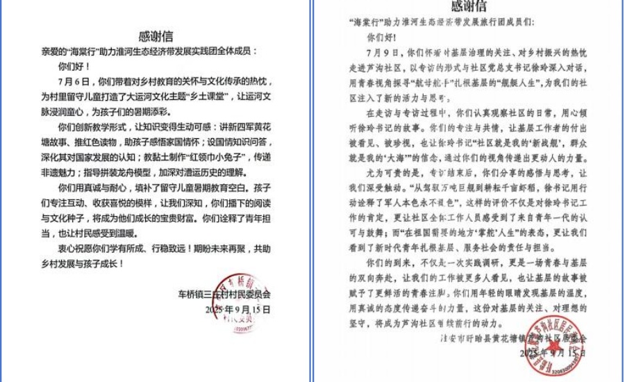 受到淮安市车桥镇三庄村、盱眙县黄花塘镇芦沟社区的感谢信