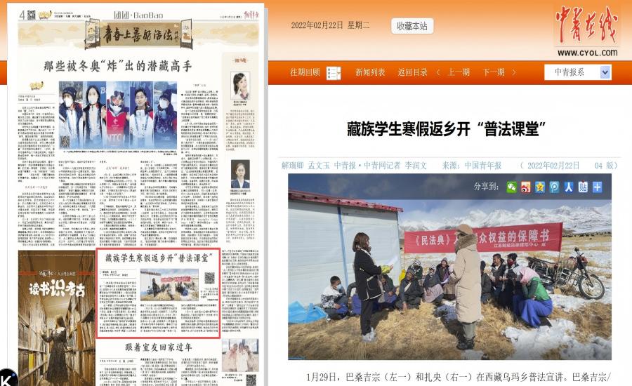 如今,巴桑吉宗作为学校先进典型,获评“中国大学生自强之星”“淮安市乡村振兴好青年”“普法先进个人”“淮安市优秀青年志愿者”等,带领团队获“江苏省大学生暑期三下乡社会实践优秀团队”“淮安市优秀青年志愿服务项目”等荣誉。截至目前,已有180余名藏族学生毕业后扎根藏区法治建设一线,有的成为基层司法所干事,有的加入本地法律援助队伍,成为连接江淮与藏区的“法治纽带”。项目受到《人民日报》《中国青年报》《中国教育报》《学习强国》《西藏新闻网》《江苏教育报》,北京卫视、安徽卫视、黑龙江卫视等媒体报道100余次,相关案例入选教育部思政课程教育资源库,获评江苏省团干部思政技能大比武一等奖。他们的故事走进学校思政课堂,激励着更多苏财院“菜籽”成为紧紧拥抱的“石榴籽”。