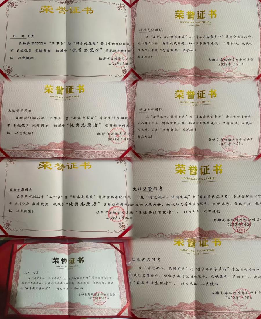 这支队伍里,不同年份的“追光者”接力前行:2022年1月,文秀加、才吉忠尕、达瓦旺姆等结合专业所学,奔赴青海玉树、海西州及西藏拉萨、日喀则等地区,围绕习近平法治思想、《中华人民共和国宪法》等内容,采用“草场式”“广场式”“晚会式”“云端式”四式普法工作法,返乡入户开展“维护祖国统一和民族团结”专题普法宣传;2023年8 月,格桑曲珍、德央等组成“羌塘普法先锋组”,联合那曲市罗玛人民政府走进乡村,用宣传单解读民事权益;2024年1月,扎西旺姆、克珠旺久等团员在平均海拔4400米的那曲市色尼区,围绕《中华人民共和国法律援助法》开展广场宣讲,热心为当地民众解答法律问题;2025年1月,德吉央宗、旦增坚参等团队成员奔赴日喀则,开展“反对家庭暴力”专题宣讲,帮助两名当地妇女脱离家暴困扰;同年6月,格桑曲珍、格码旦增、章茜文等成员走进拉萨城关区幸福苑解读《中华人民共和国民法典》《中华人民共和国法律援助法》,热心向民众介绍遇到困难如何寻求法律援助。