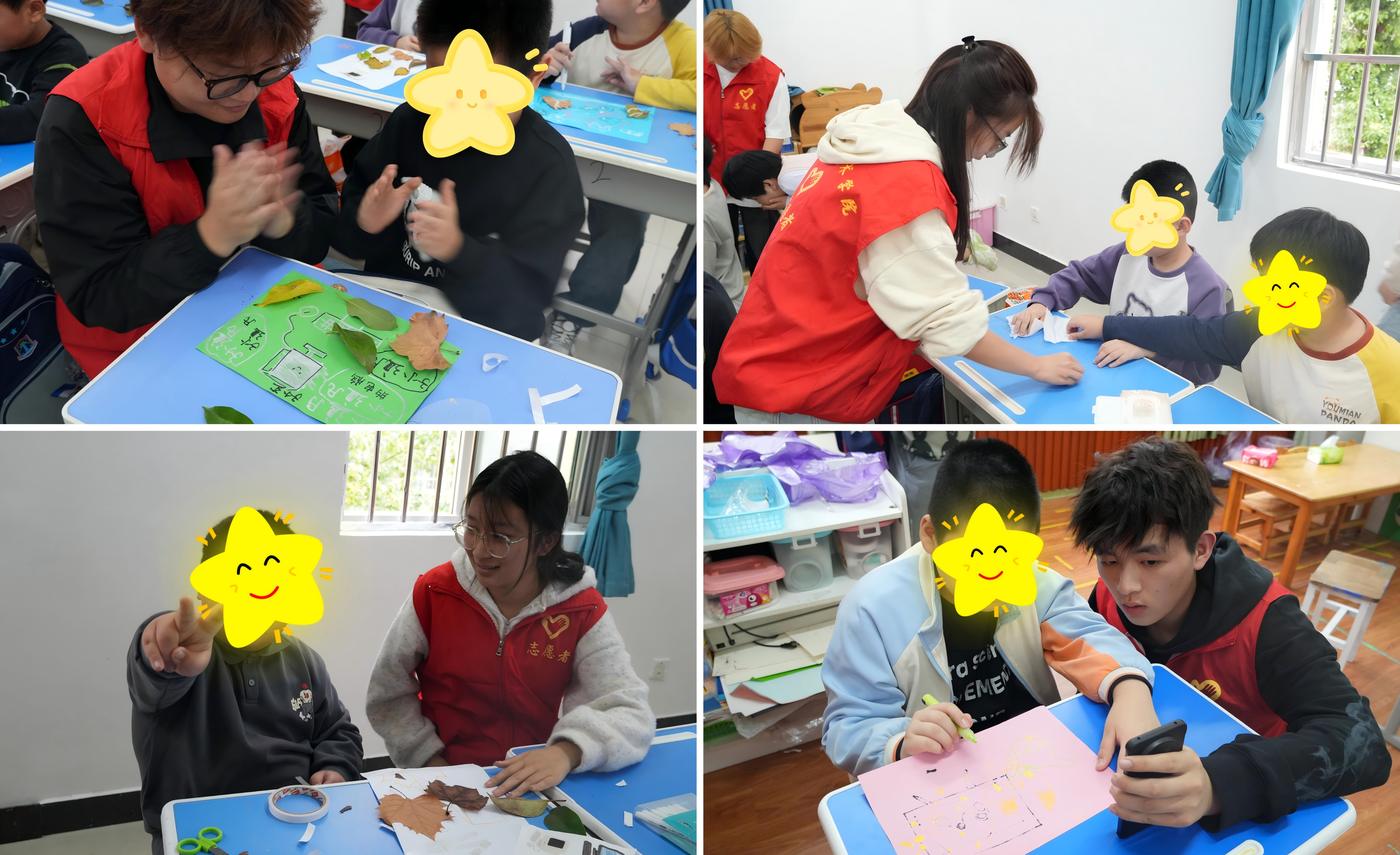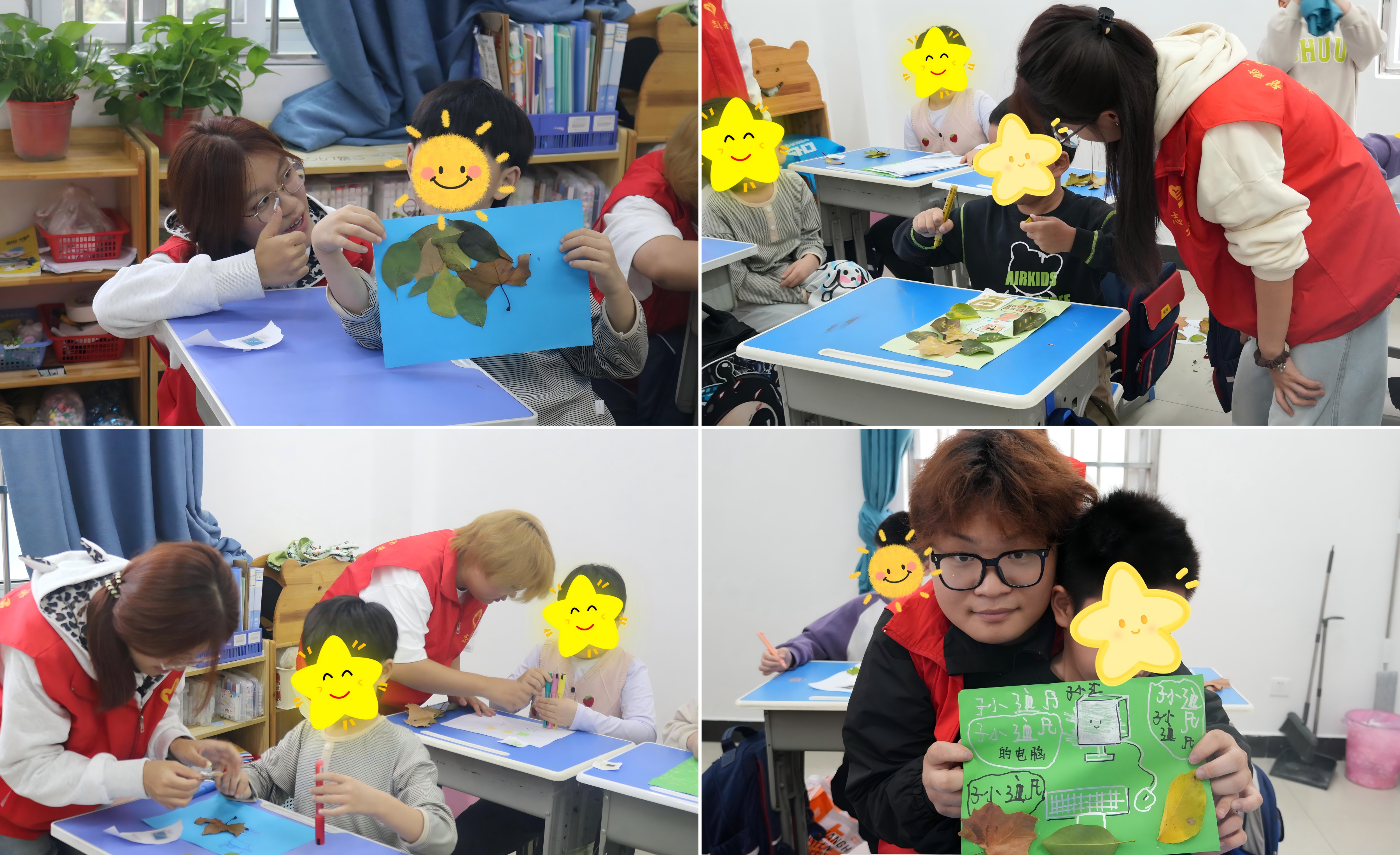活动伊始,志愿者分为三组,先以亲切问候拉近与孩子的距离,随后取出画笔、双面胶、风干树叶、卡通电脑图案临摹纸、彩色卡纸和剪刀等材料,俯身引导孩子巧用形态各异的秋叶创作,在志愿者的鼓励下,孩子们的想象力肆意绽放,平凡的树叶被赋予新生命,化作灵动的翅膀、游弋的小鱼,或是挺拔的参天大树。一幅幅满是童趣与自然气息的拼贴画渐次成型,小小的教室俨然成为创意飞扬的艺术天地。