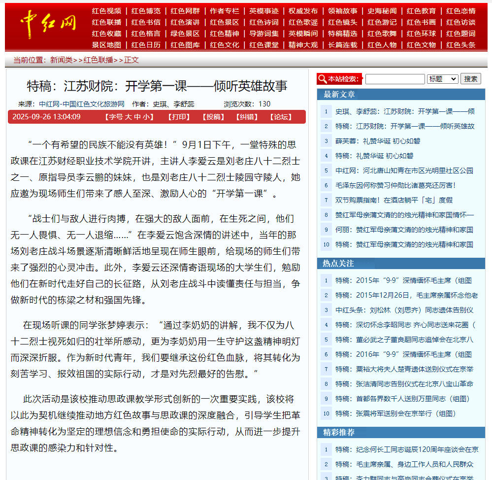 “一个有希望的民族不能没有英雄!”9月1日下午,一堂特殊的思政课在江苏财经职业技术学院开讲,主讲人李爱云是刘老庄八十二烈士之一、原指导员李云鹏的妹妹,也是刘老庄八十二烈士陵园的守陵人,她应邀为现场师生们带来了感人至深、激励人心的“开学第一课”。