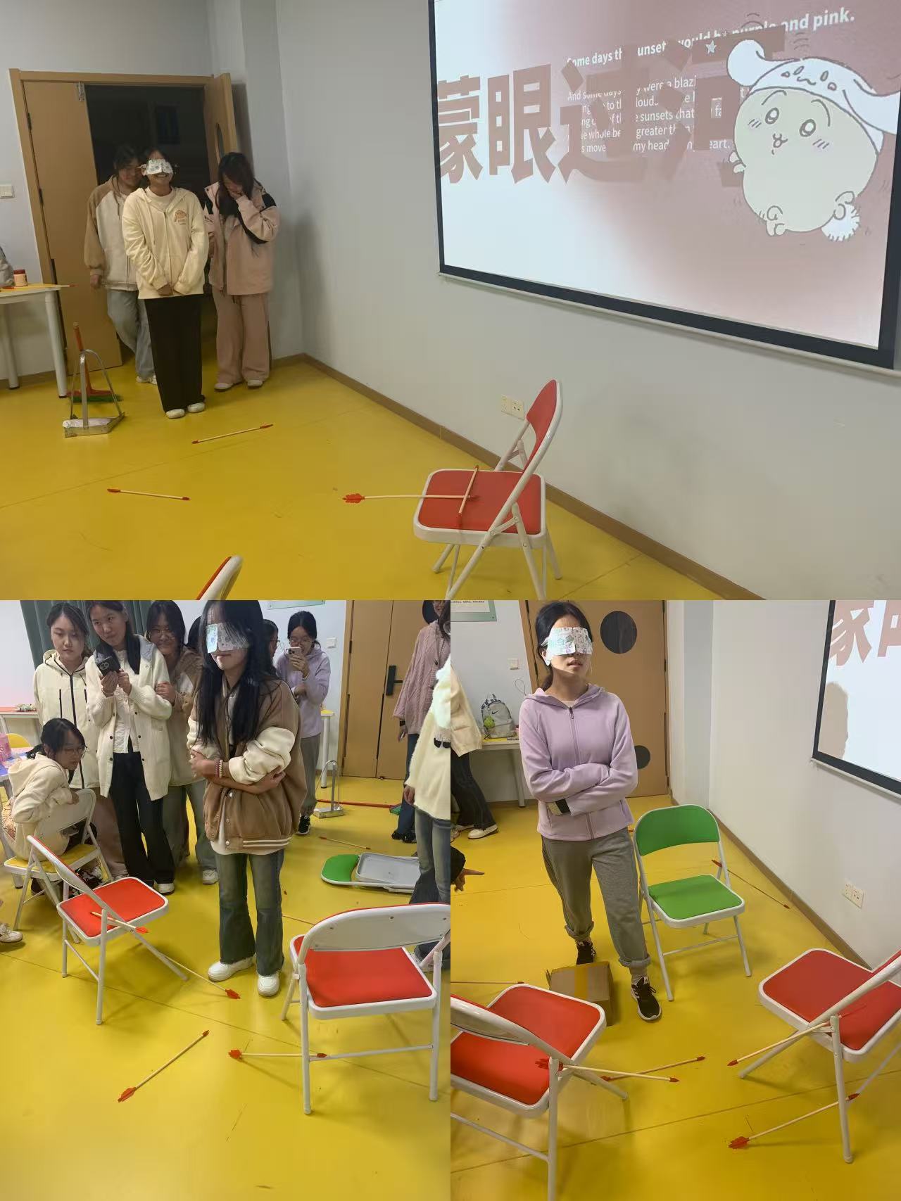 活动通过“名字接龙”破冰开场,以趣味形式快速拉近参与者距离;随后“情绪盲盒交换计划”环节,学生匿名书写感悟、困惑或祝福,通过随机交换卡片实现心灵对话,让学生在匿名交流中感受理解与善意。紧接着在“害你在心口难猜”“蒙眼猜人”等趣味游戏中,学生通过肢体语言、声音辨识等方式增进默契,现场氛围热烈融洽;压轴的“蒙眼过河”挑战将活动推向高潮,参与者蒙眼跨越障碍,仅凭同伴指引完成任务,在协作中深化信任,彰显团队力量。