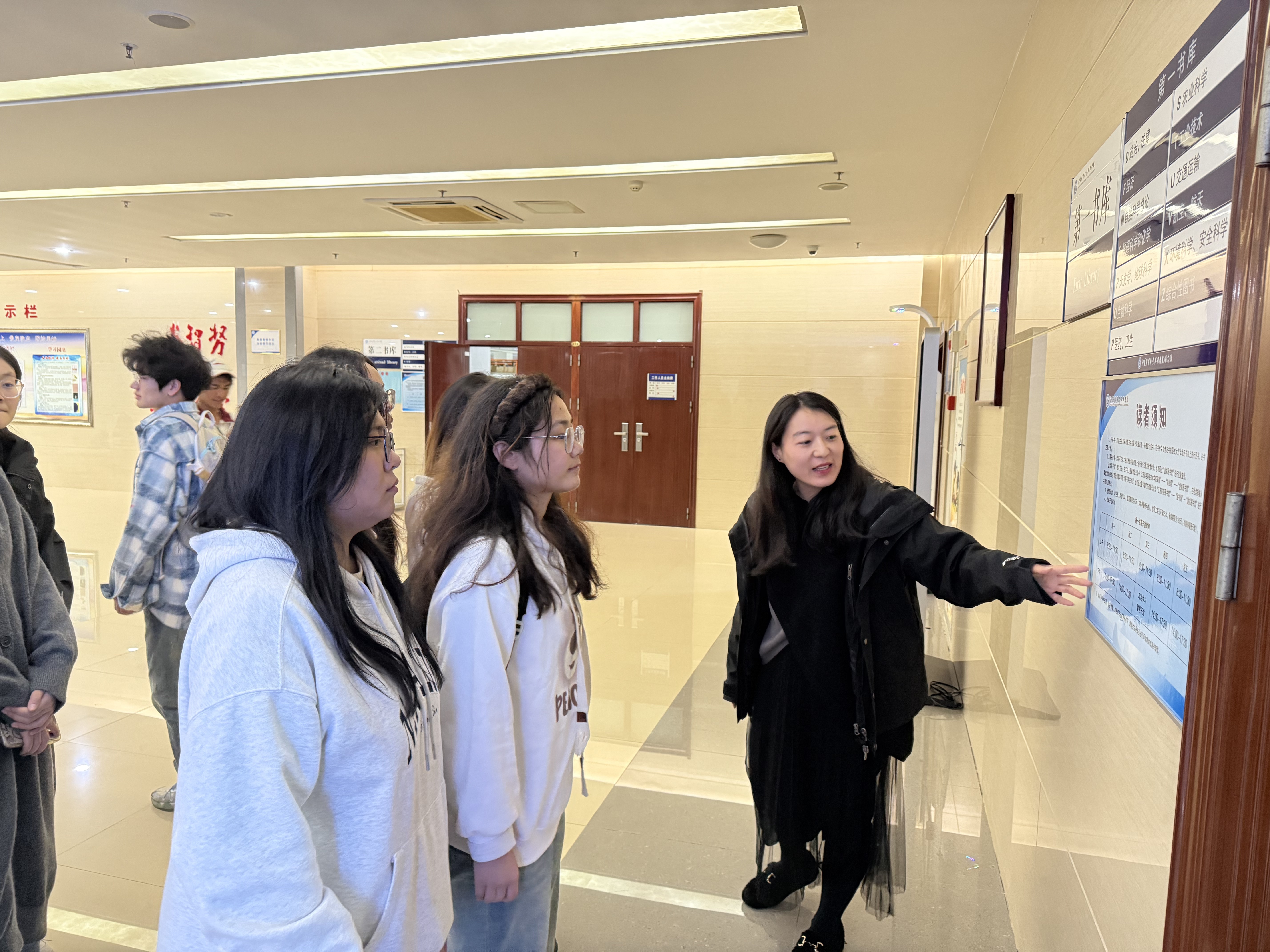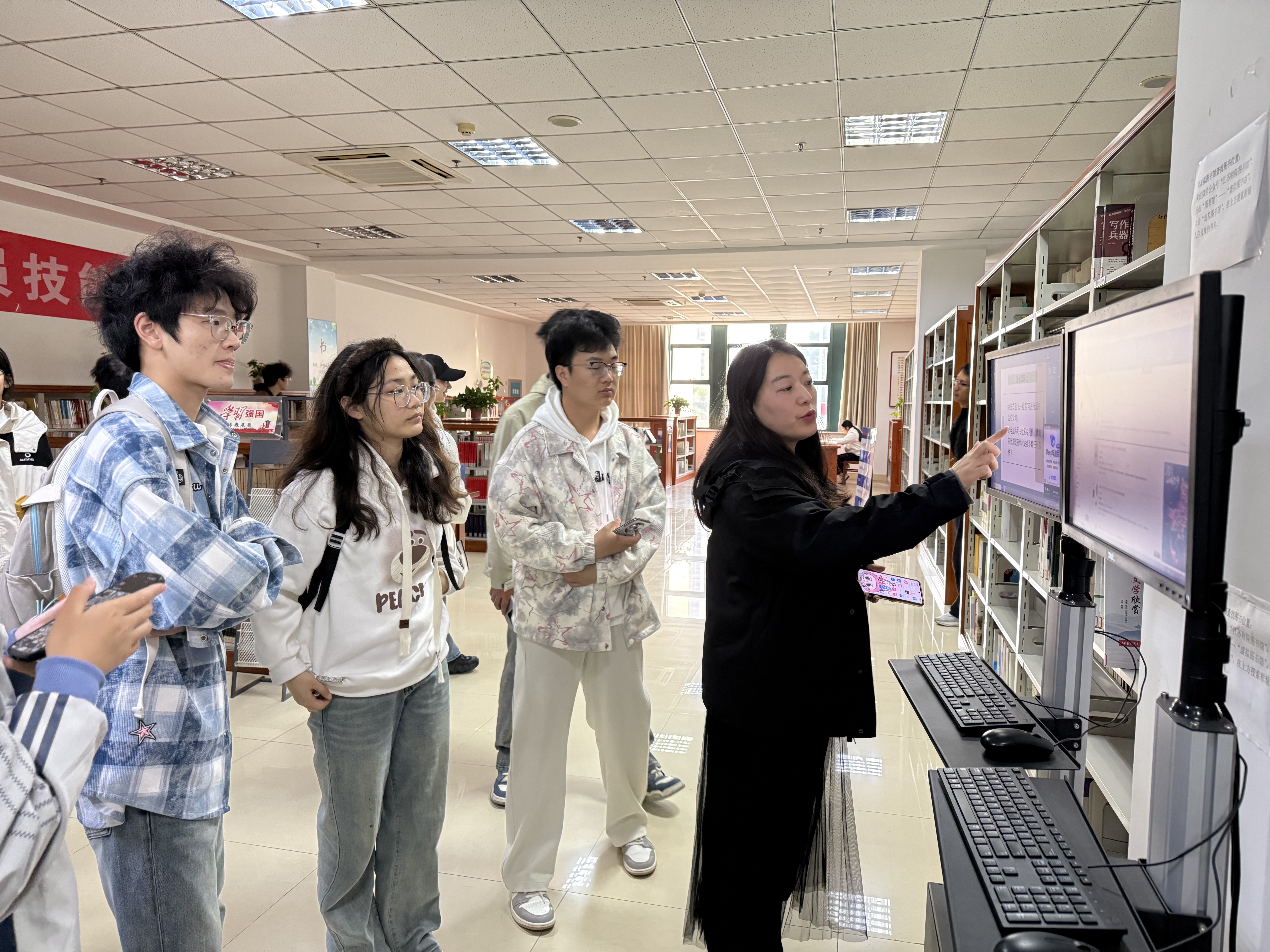 活动伊始,图书馆老师带领同学们进行功能区域实地打卡,从密集书库的文献典藏到开架阅览区的分类陈列,现场演示了自助借还机、电子检索系统的操作技巧。针对同学们关注的“热门图书借阅榜”,老师揭秘了其“借阅频次 + 馆藏流通率 + 专业适配度” 的三维更新规则,鼓励大家借助榜单拓展阅读边界,高效利用馆藏资源。