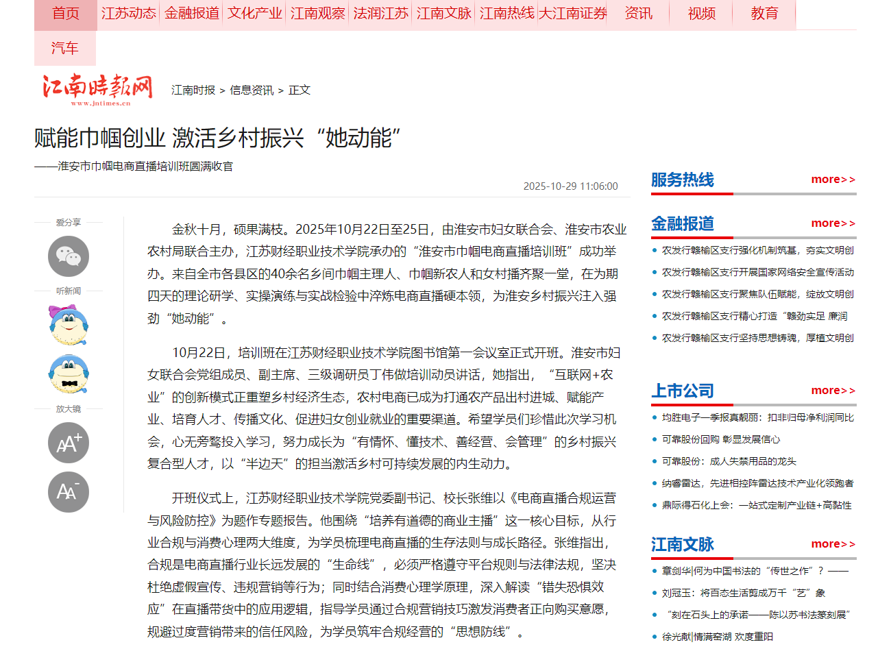 金秋十月,硕果满枝。10月22日至25日,由淮安市妇女联合会、淮安市农业农村局联合主办,江苏财经职业技术学院承办的“淮安市巾帼电商直播培训班”成功举办。来自全市各县区的40余名乡间巾帼主理人、巾帼新农人和女村播齐聚一堂,在为期四天的理论研学、实操演练与实战检验中淬炼电商直播硬本领,为淮安乡村振兴注入强劲“她动能”。